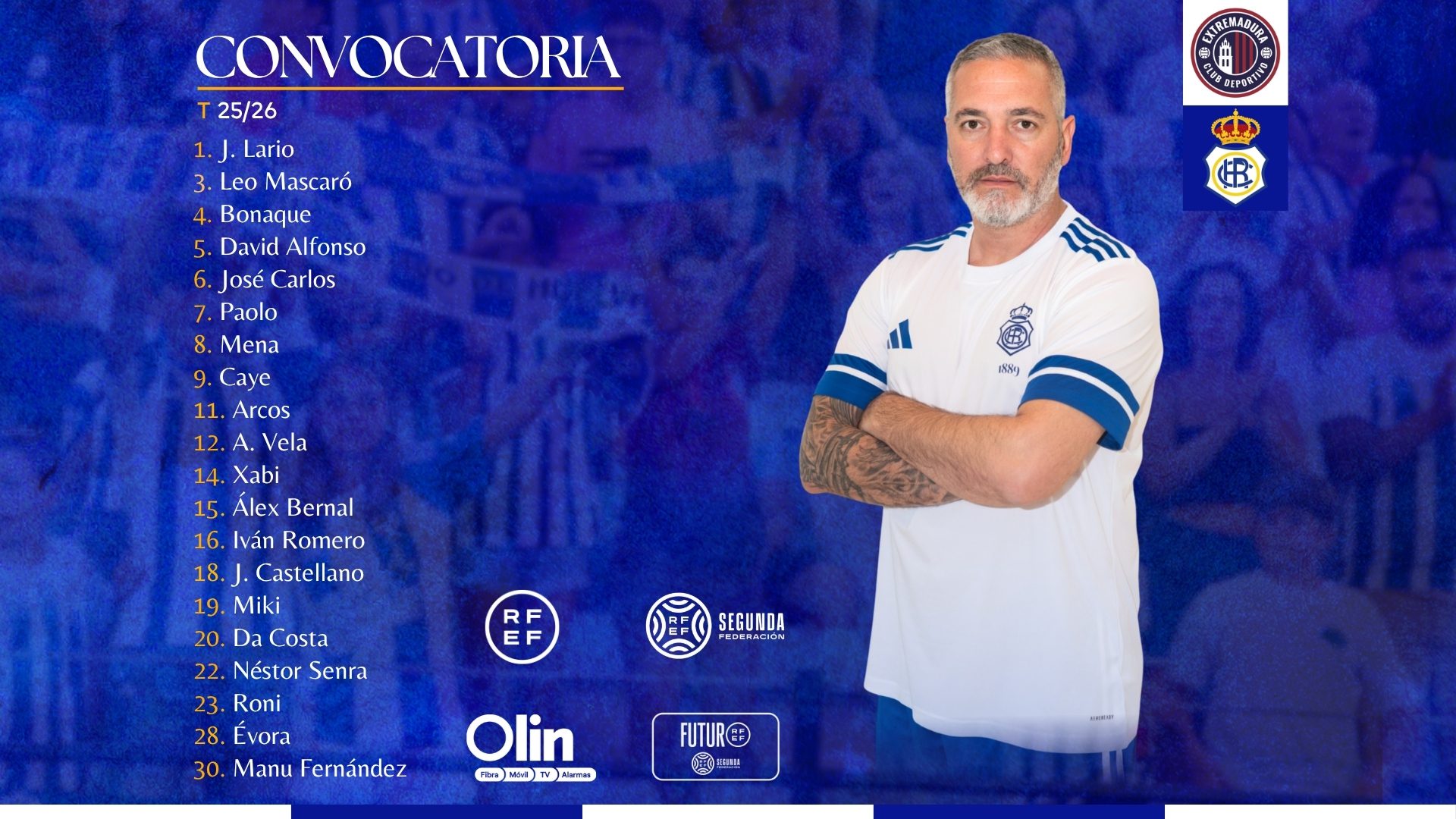 Esta es nuestra convocatoria para el partido de este domingo frente al CD Extremadura en el Estadio Francisco de la Hera, en la jornada 31 de la Segunda RFEF: 1. Jero
